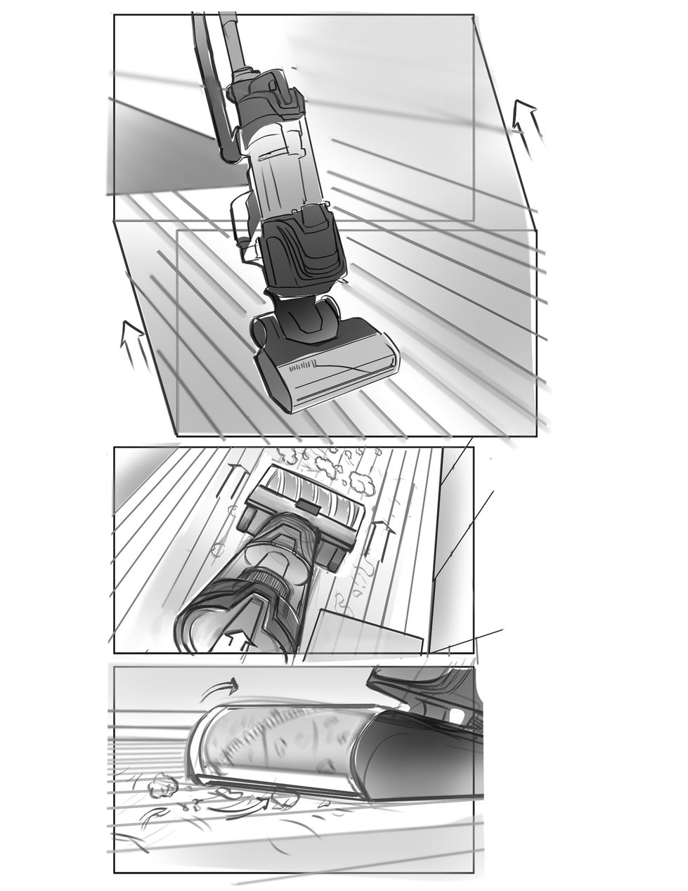 A series of storyboard panels depicting scenes of vacuuming mess, spills, and pets watching the action unfold. The goal was to highlight this new Bissell CleanView's ability to clean up messes of various types.